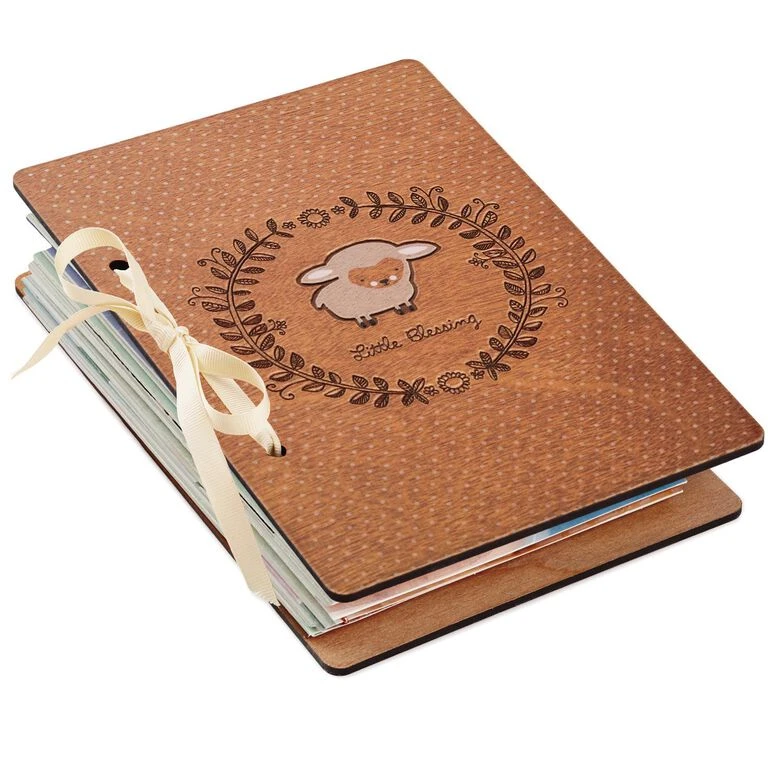 When baby is born, you want to hold onto every memory and milestone. Preserve and enjoy the heartfelt greetings you received by storing them in this adorable card holder. Wood panels with an etched image of a sweet lamb on the front cover are designed to hold a stack of cards, while decorative ribbon makes it expandable and secures them together to create a memorable keepsake you can browse and share. Makes a great baby shower or baptism gift idea.