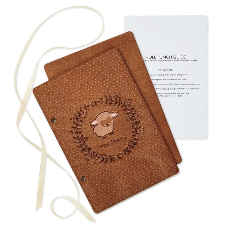 - Includes 2 decorative wood panels for front and back cover, grosgrain ribbon and paper template to use as hole punch guide. (Hole punch not included.)