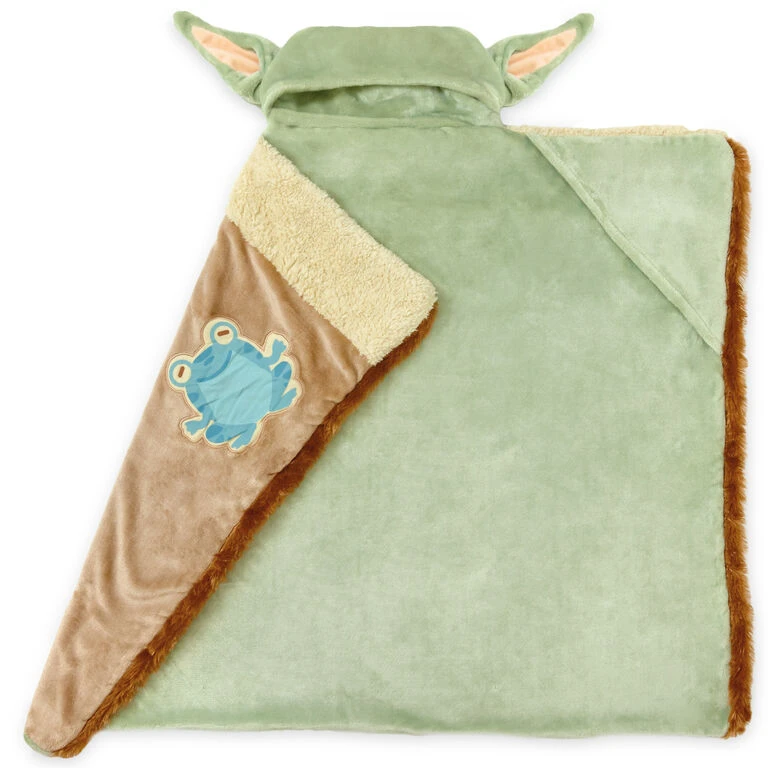 - Star Wars: The Mandalorian soft plush blanket with hood features a design of The Child named Grogu crafted in 100% polyester fabric with embroidered details.